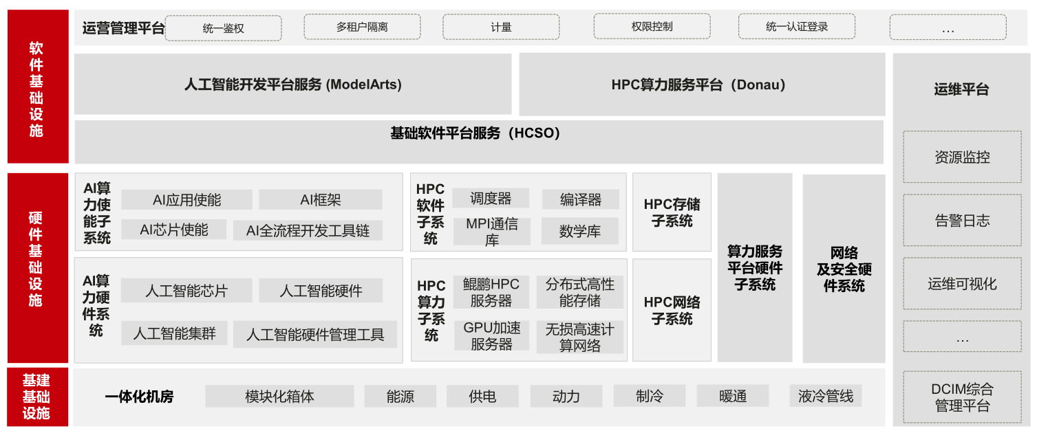 本项目主要包括算力平台及服务建设(含 AI 算力硬件系统、AI 算力使能子系统、基础计算硬件系统、网络及安全硬件系统)、算法平台及服务建设(含人工智能算法工具、人工智能基础服务平台、运营管理平台)、算力调度平台建设(含算力调度平台、人工智能芯片性能测试平台)、配套基础设施建设。